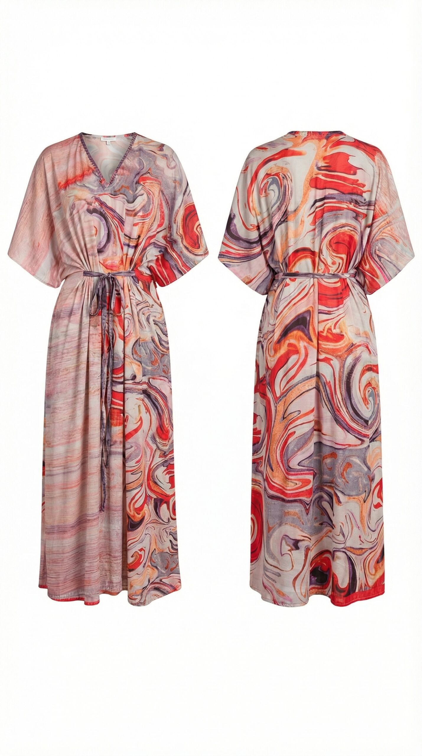 Free size Relaxed full-length silhouette Adjustable drawstring waist Soft V-neckline Lightweight breathable fabric Each kaftan is one-of-a-kind