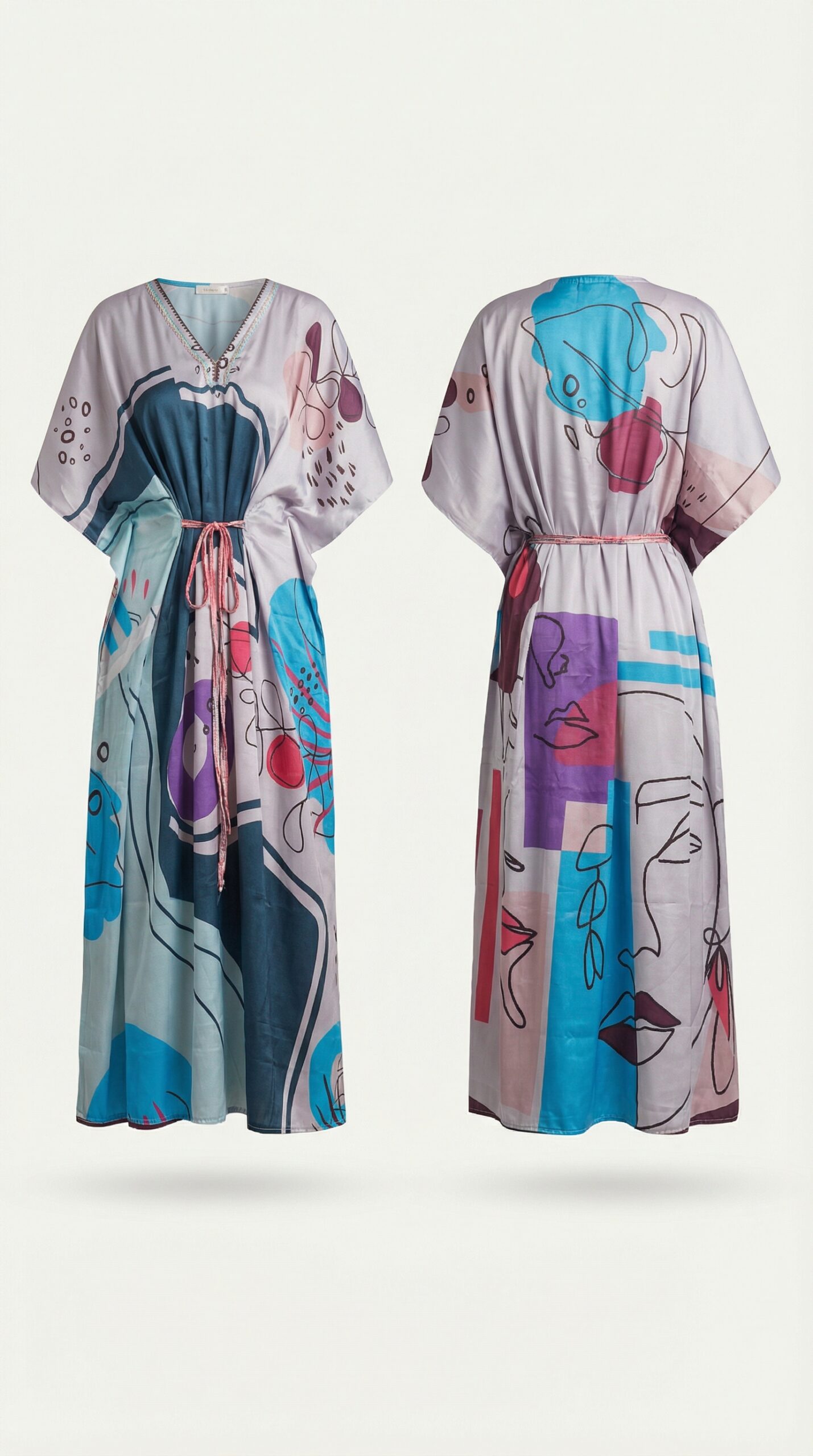 Free size Relaxed full-length silhouette Adjustable drawstring waist Soft V-neckline Lightweight breathable fabric Each kaftan is one-of-a-kind