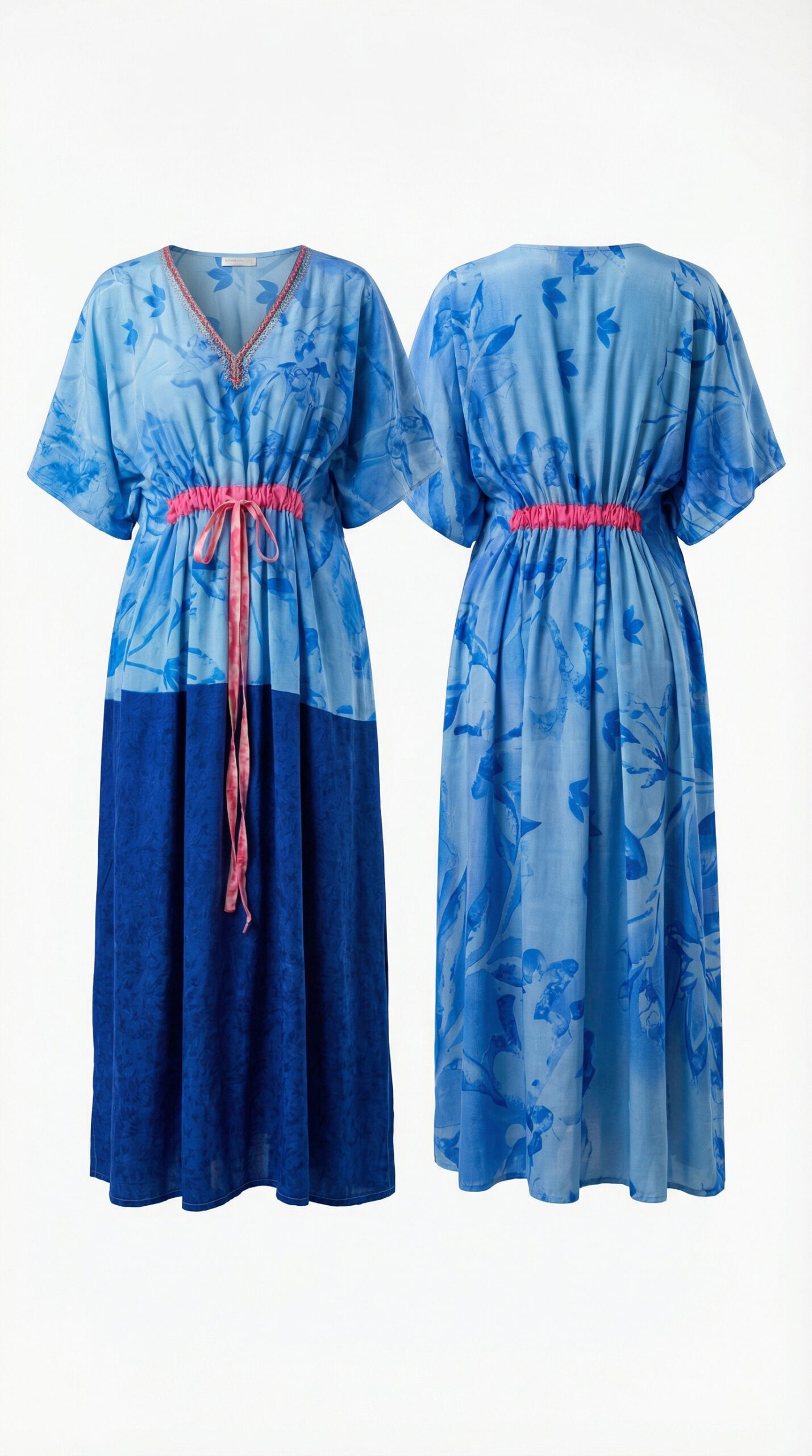 Free size Relaxed full-length silhouette Adjustable drawstring waist Soft V-neckline Lightweight breathable fabric Each kaftan is one-of-a-kind